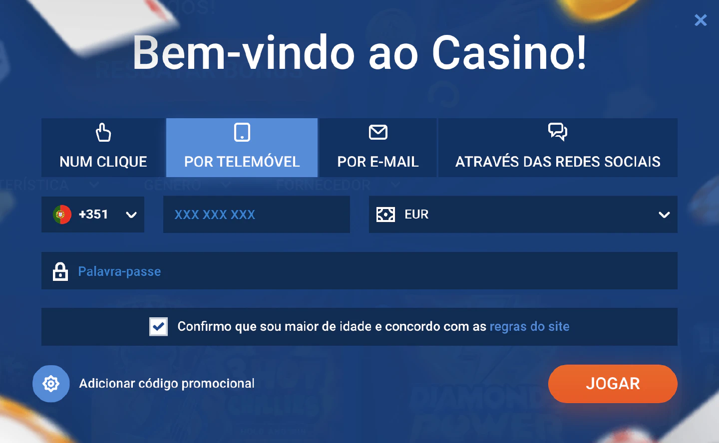 Introduza o seu número de telemóvel, selecione a moeda, e receberá um código de confirmação por SMS. Defina uma senha.